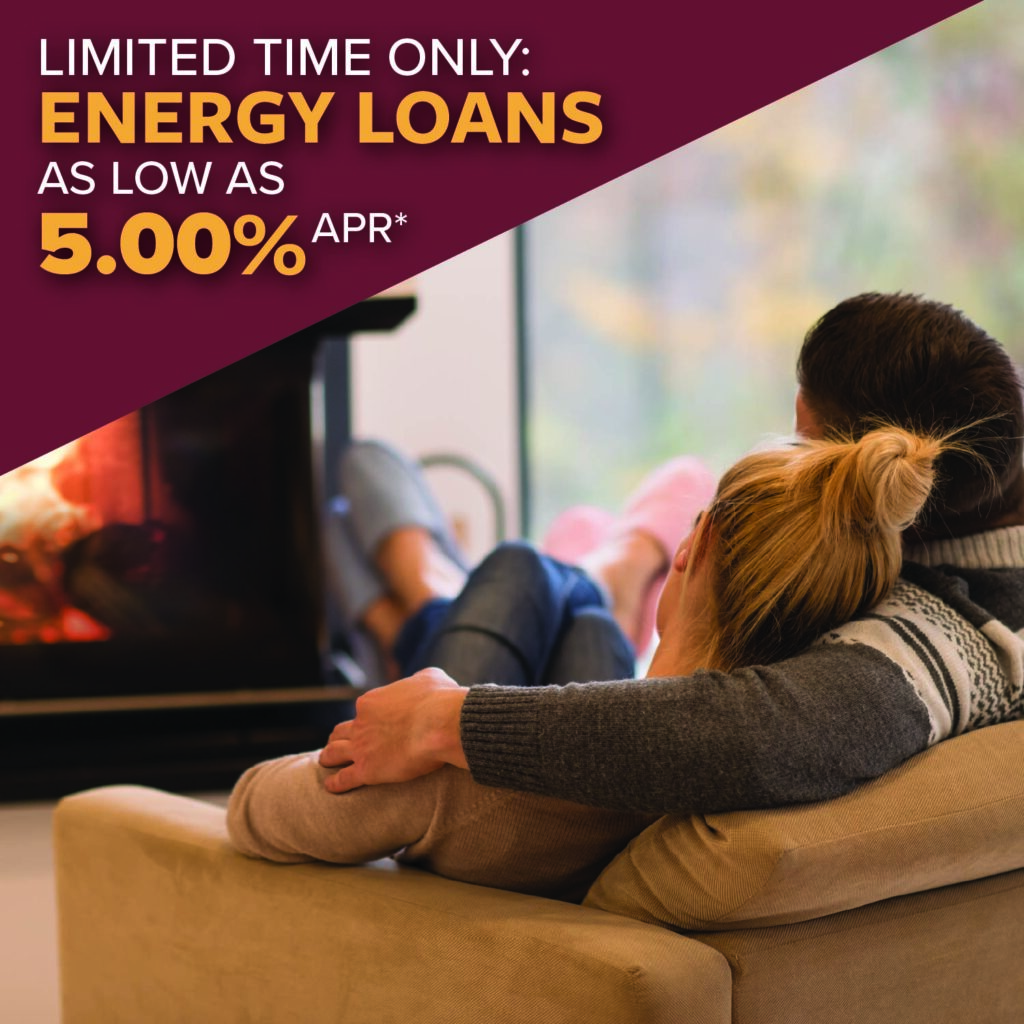 We now offer Energy Loans to our members at competitive rates year-round, which can be used to purchase fuel, oil furnaces, windows, siding with weather wrap, wood or pellet stoves, wood or pellet furnaces, new interior and/or exterior doors, heat pumps, solar panels, and geothermal heating systems.
